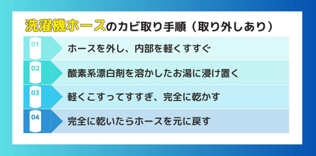 ホースが取り外せる場合は、酸素系漂白剤による浸け置き洗いが最も安全で確実です。
