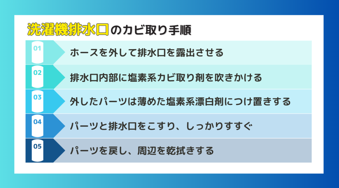 また、ホースの掃除とあわせて排水口のカビ取りも行うと、より効果的です。