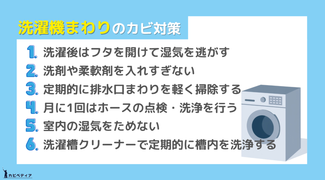 特に梅雨や夏場は湿度が高くなるため、こまめに換気を行い、洗濯機まわりをしっかり乾かすことが大切です。