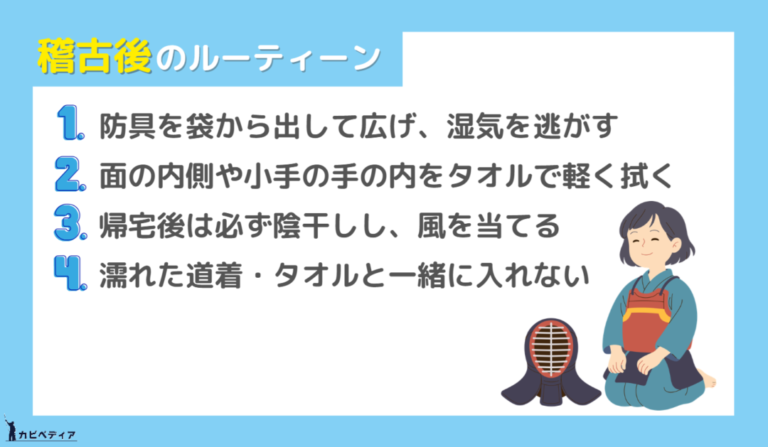 ここでは、稽古後のルーティンや保管方法など、今日から実践できる予防のポイントを紹介します。