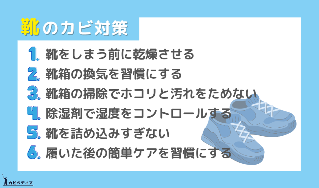 再発防止の鍵は、靴を乾かし切ってから収納することと、靴箱の湿気と通気性を整えることです。