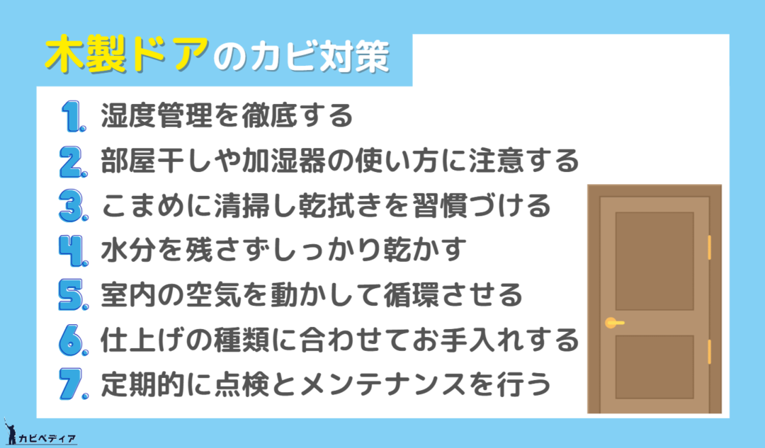 また、加湿器は湿度50%を超えないように調整し、吹き出し口が木製ドアに直接当たらないようにすることが大切です。