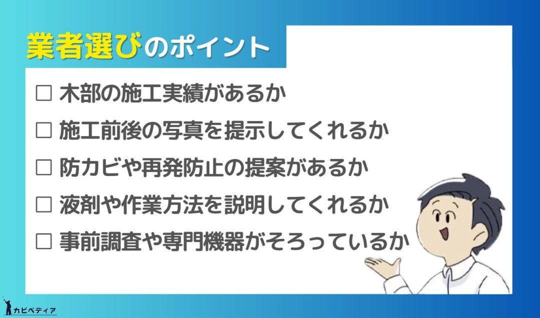 そのようなときは、木部の施工に詳しいカビ取り業者に相談するのが安心です。