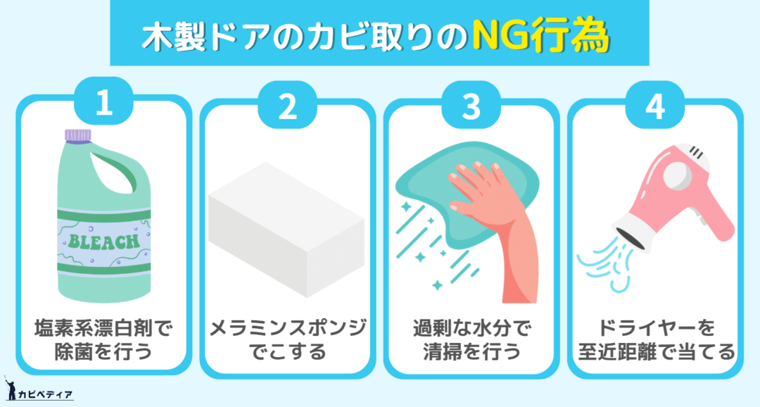 カビキラーやキッチンハイターなどの塩素系漂白剤は確かにカビを落とす力が強いですが、木製ドアには不向きです。